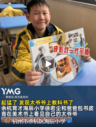 余杭育才海辰小学徐若尘和爸爸包书皮,竟在美术书上看见自己的太爷爷,讲起来骄傲的表情根本藏不住。