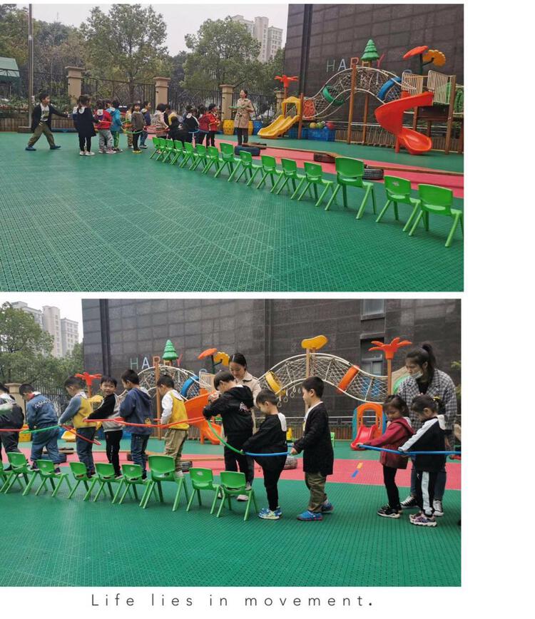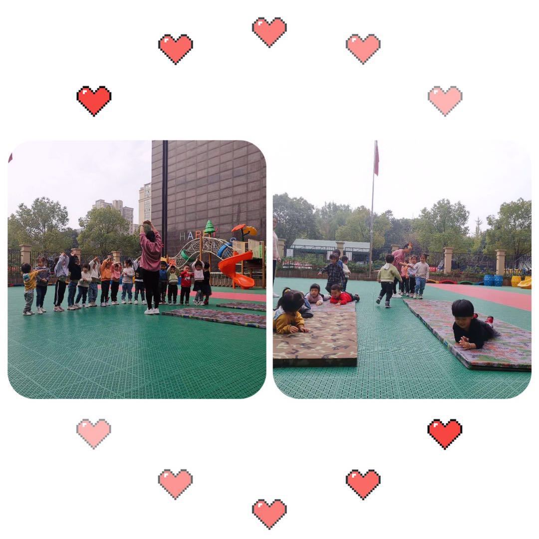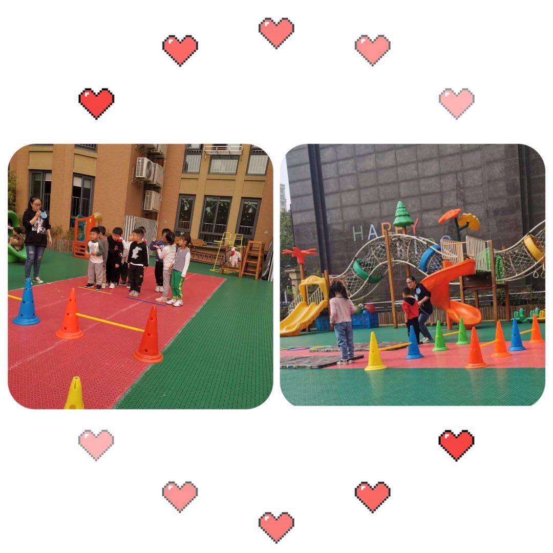 杨老师——《寻宝总动员》。在活动中,孩子们积极探索新动作,独立或合作设计完成动作,并能够单脚连续向前跳,下肢的力量和耐力得到了发展。