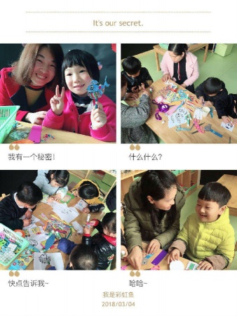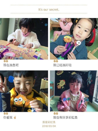 在遥远的大海深处住着一条美丽的彩虹鱼,它的身上有彩虹般美丽的鳞片。“创意书签制作”来自绘本《我是彩虹鱼》,孩子们制作的每一个书签都是如此的独一无二。