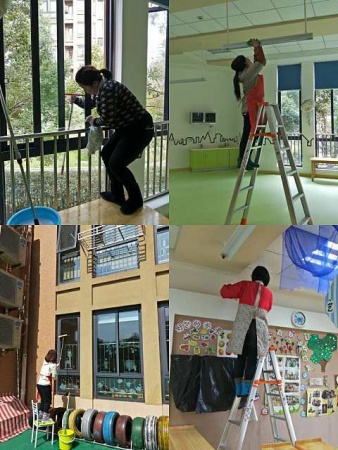 全员大行动,我们辛勤的老师把幼儿园打扫得干干净净,焕然一新,为宝贝们创建一个舒适温馨的幼儿园环境。