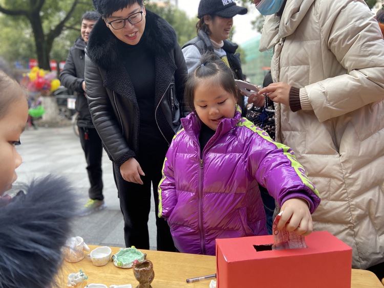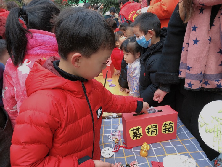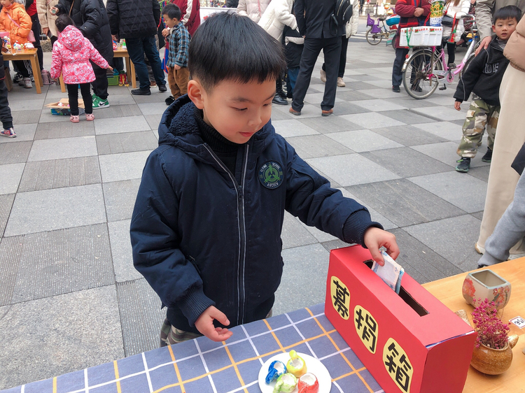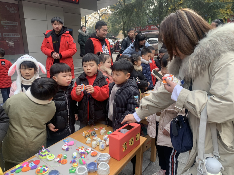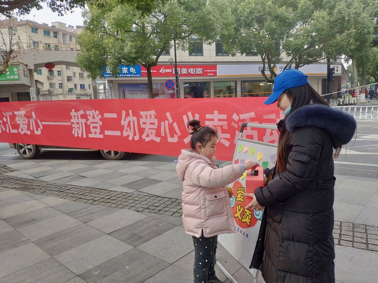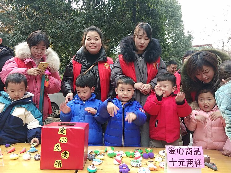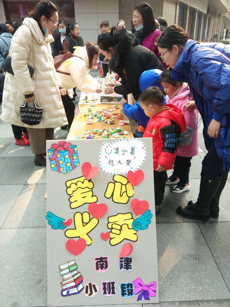 为了让幼儿从小树立关爱他人的意识,养成乐于助人、奉献爱心的良好品质,增加幼儿的社会体验与交往能力,帮助更多需要用爱来温暖、关怀、鼓舞和激励的人们,2020年12月19日,新登镇第二幼儿园第六届乐玩节爱心义卖活动在新登镇移动公司门口拉开了帷幕。 义卖风采 本次义卖活动的作品都是我们新登二幼的老师和小朋友们一起创作的陶泥、彩泥作品。作品类型多样、种类丰富,每一件作品都蕴含着大家的爱心。 小班段义卖 活动现场 小班的老师孩子们,用彩泥装饰铅笔、发夹等,使得原本简单的铅笔瞬间变得充满童趣和活力,孩子们也更是积极地叫卖着,“快来买呀!快来买呀!” 滑动查看更多 中班段义卖 活动现场 中班段的孩子们用陶泥制作了好看的各种挂饰、小动物等等,义卖的时候还会用好听的语言向客人介绍,各个班级的作品都十分畅销! 大班段义卖 活动现场 “你快看这个枪,金黄金黄的,很有威力哦,很适合男生的,你要不要买一个。” “这个蓝色的小杯子可以用来喝水,虽然小小的,但是很漂亮的,你要不要买一个呀!” “这个彩泥是我们班做的,这里有一个小洞洞,里面有很多漂亮的点点,你快买去吧!” 奉献爱心 左右滑动查看更多 左右滑动查看更多 一双双小小的手将爱心放到了一个个红色的爱心箱里,我们的爱就这样开始传递! 我的心愿 我的心愿是希望自己能够唱歌唱得很厉害,这是我画的一个话筒! 我的心愿是希望自己能够成为英雄,帮助更多的人,拯救世界! 我的心愿是能够快快长大,长大能做很多事情! 义卖活动结束后 由各班教师与家长代表共同清点本班义卖款项 所得义卖数额全部捐给 幼儿园困难户家庭 爱,无处不在 ○ 爱心,就在举手之间 ○ 奉献一片爱心 请留下你指尖的温度 让太阳拥抱你 与我们一路同行,与爱为伴~