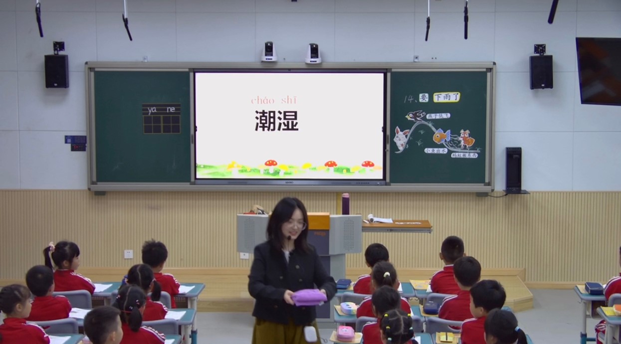 周老师将集中识字和随文识字相结合,指导学生从“形声字、做动作”等方法去识记和理解汉字,如:老师拿出了湿毛巾让孩子们直接感受什么是“潮湿”。识字环节设计得相当巧妙。