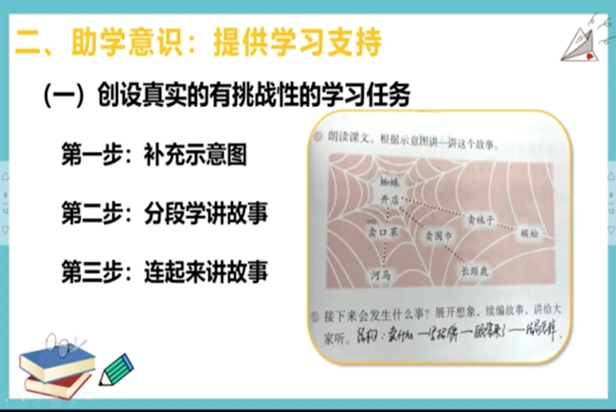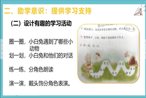 平常在教学中,老师还应树立助学意识。可以通过创设真实的有挑战性的学习任务和设计有趣的学习活动给孩子们提供学习支持。