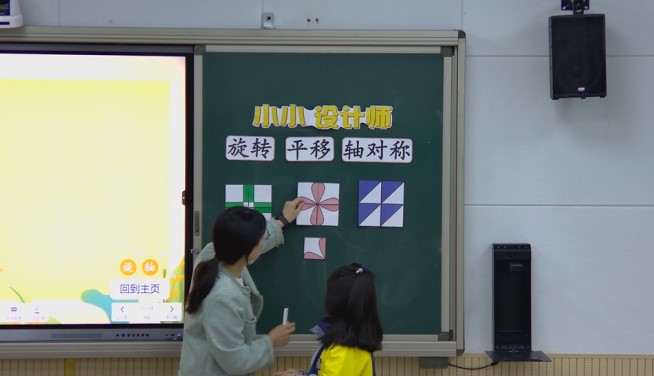 上课伊始,葛老师通过展示生活中的一些现象,让孩子们欣赏各类图案,体会轴对称、平移和旋转在生活中的广泛应用。
