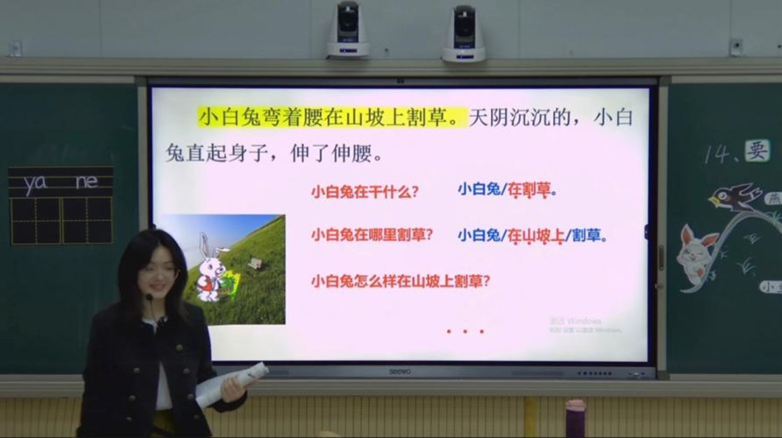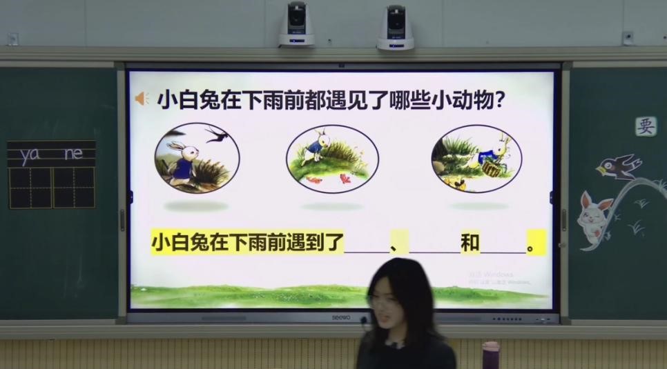 周老师循循善诱,帮助学生用完整的话讲出了小白兔遇到的几个动物。