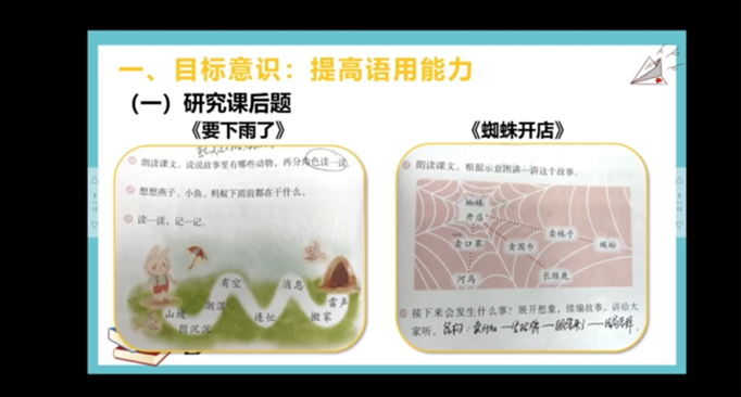 周校长提出在平常的语文教学中要有目标意识,多关注并研究课后习题,剖析课后习题的侧重点,并在教学环节中落实;多研究课堂作业本,在平时的教学中恰当使用并优化作业本;潜心研究教材的特点。