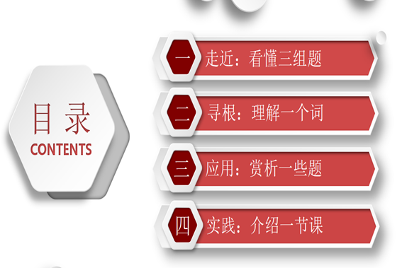 李校长从目前的现状分析入手,指出了目前作业成了“做厌”,亟需改革。整个讲座分为四个大块:①走进:看懂三组题;②寻根:理解一个词;③应用:赏析一些题;④实践:介绍一节课。