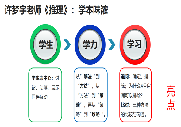 首先,许老师以有趣的游戏让学生初步感知什么是推理,简单易懂,极大地激发了学生的学习兴趣。