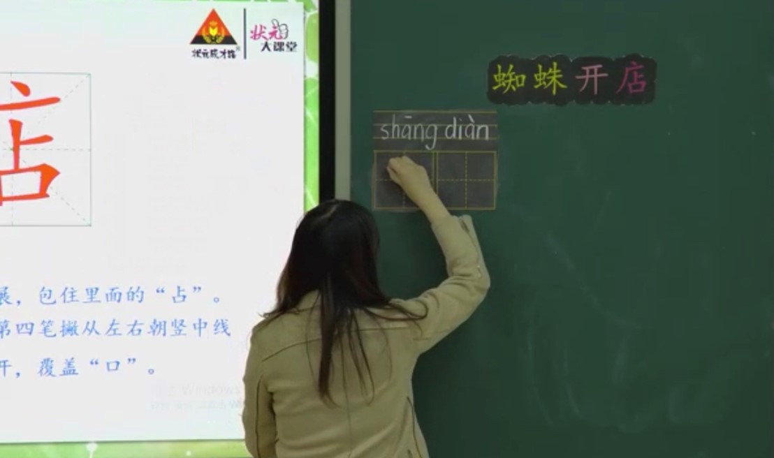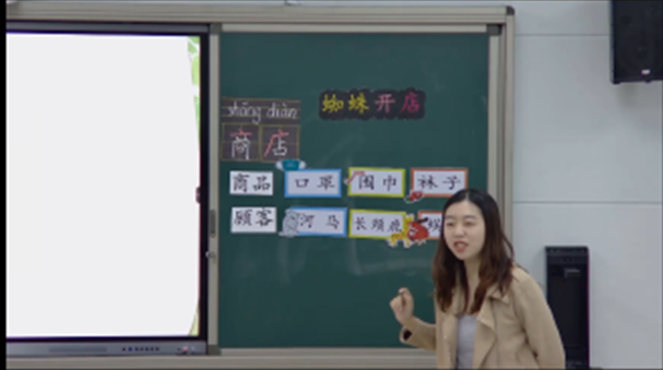 王老师巧妙地将识字与课文内容结合起来,自然地引出了“商店”一词并指导孩子们如何写好这两个字。