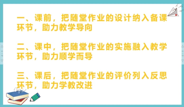周老师从课前、课中、课后这三个方面出发,给我们教师指明了方向,帮助老师们把随堂作业的用处发挥到最大。