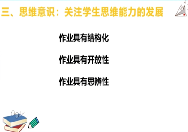 周老师认为在平时应多培养学生的思维意识,关注学生的思维能力的发展,这也意味着作业设计应更具结构化、开放性和思辨性。