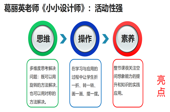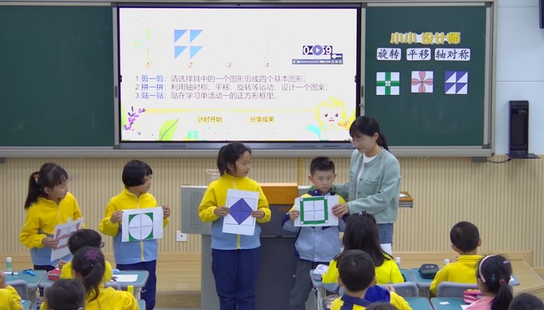 整节课堂环环相扣,学生们思维活跃,在各个活动中学习和夯实图形运动的知识,在自主探究尝试和小组合作中,进一步拓展创意思维和实践能力。