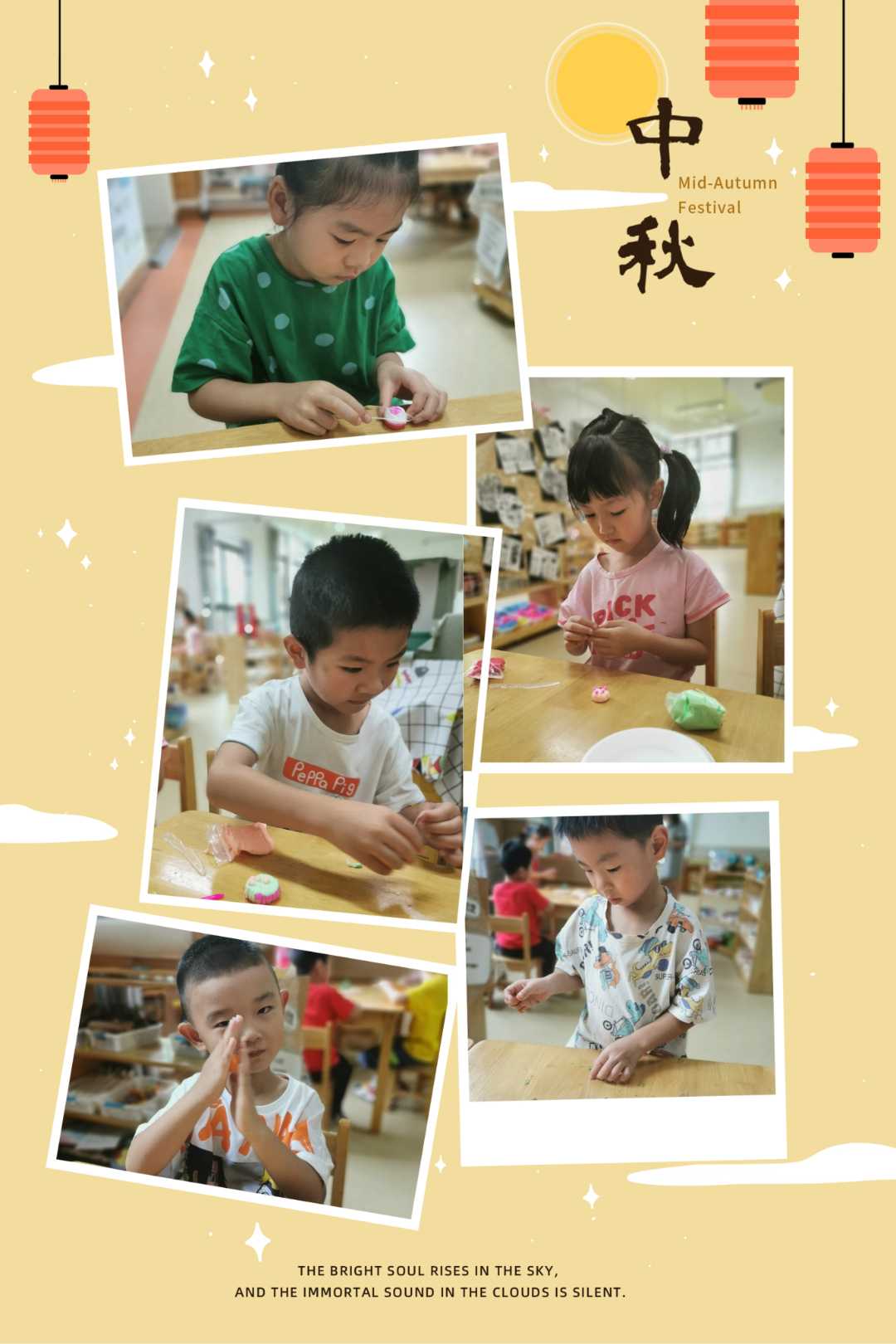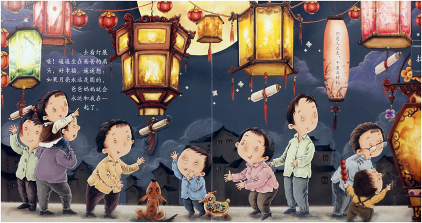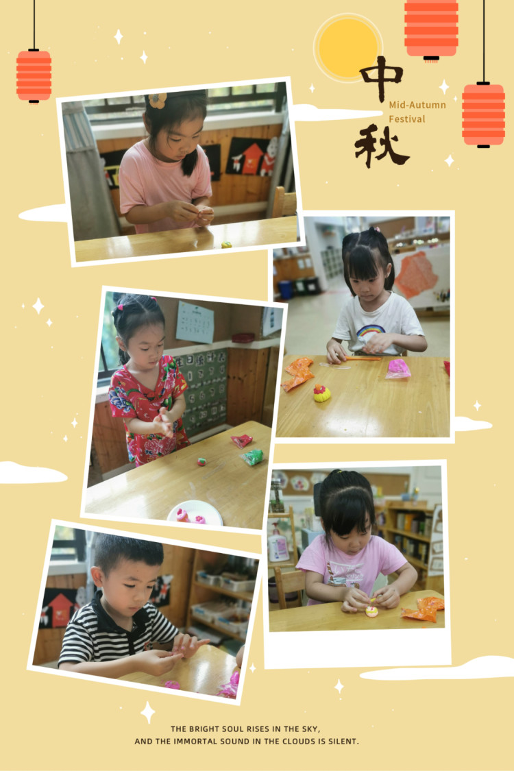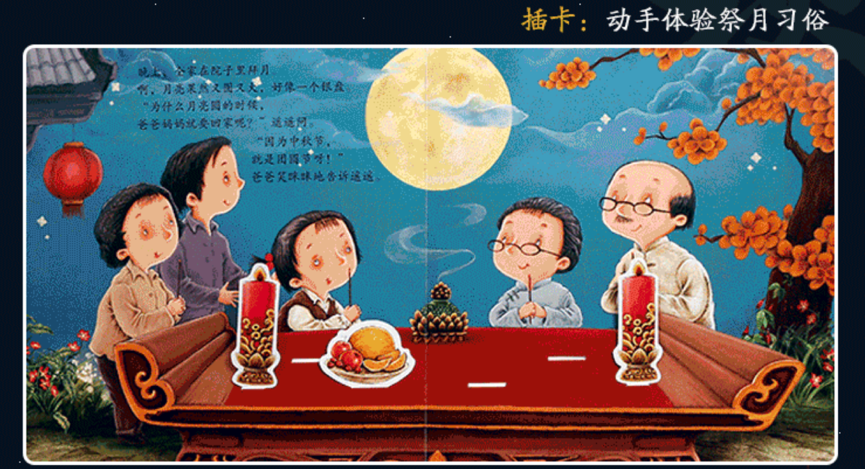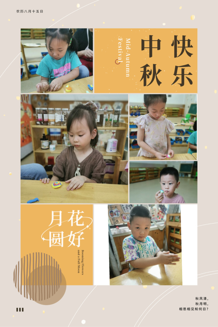 秋风送爽,金桂飘香,月圆中秋之际,让我们一起开启“中秋”之旅吧! “又是一年月圆时,金满桂枝共婵娟 ”。中秋节又称团圆节,自古便有祭月、赏月、拜月、吃月饼、赏桂花、饮桂花酒等习俗,流传至今,经久不息。小朋友们,你们知道中秋的来历吗?跟着老师一起了解一下吧! 给孩子们营造一个充满节日气氛的环境,同时也为了锻炼孩子们的动手能力,在中秋节前夕请小朋友们利用班级里的材料 ,一起制作了月饼和灯笼,快来看看大家制作的精彩照片吧! 老师给孩子们推荐几本有关中秋节的绘本,其中既有关于中秋的节日民俗与文化内涵的,也有关于月亮由来的奇妙想象与科学探索。希望它们能带给孩子一个温馨、甜蜜又充满小惊喜的中秋! 《中秋节》立体书 内容简介: 每天遥遥都眼巴巴地盼望着,月亮能早一点变圆。因为爷爷奶奶说,月圆了,中秋节就到了,这一天,外面的游子都要回家团圆,她就能见到爸爸妈妈了。遥遥跟奶奶一起做月饼,和爷爷一起做兔儿爷。在中秋节这天晚上,全家团圆,一起赏月、祭月。晚上,遥遥做了一个关于嫦娥的梦…… 《小星星的大月饼》 内容简介: 天上住了一个叫小星星的小女孩,她和妈妈一起做了一个大大的月饼。烤好后,妈妈把大月饼挂在空中晾凉,并且嘱咐小星星没有妈妈的同意不可以吃。可是,小星星却禁不住大月饼的诱惑,每天夜里偷偷跑到大月饼旁边咬上一小口,于是,我们眼中的月亮就从圆一点一点变小了…… 中秋的月儿圆圆、中秋的月饼香香,中秋的话儿甜甜,中秋的快乐多多。希望通过中秋节主题活动,大二班的萌娃们对中秋节会有更进一步的了解与体会,在快乐的时光里体验学习与成长,过一个团圆美好的佳节。 中秋佳节,月圆人更圆。 至此中秋节来临之际 预祝大家中秋节快乐!