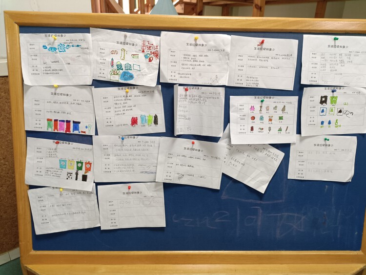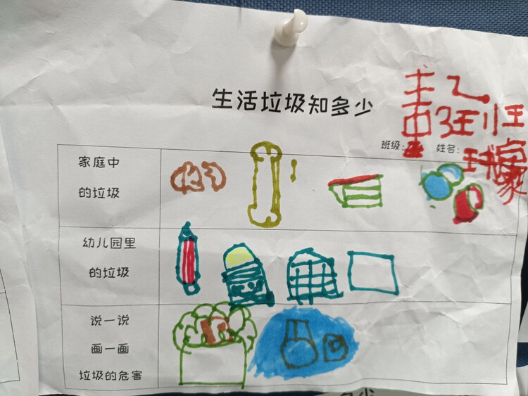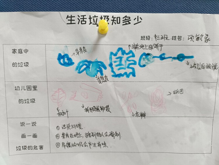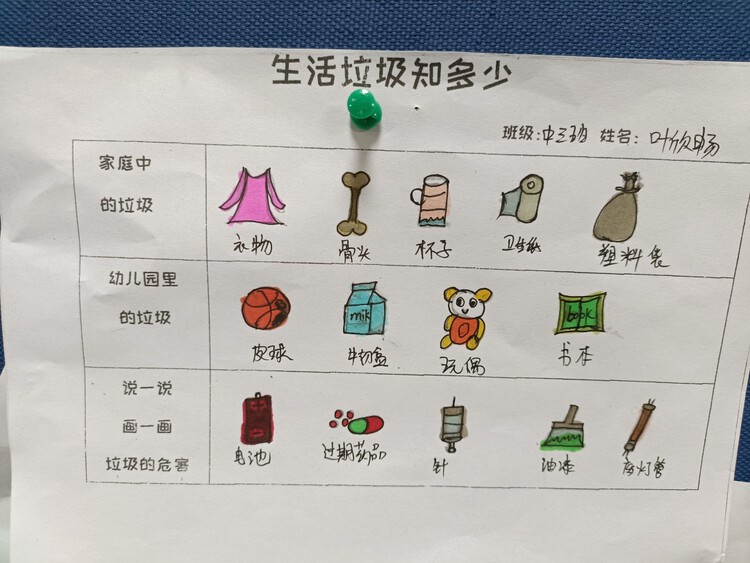 孩子们互相分享自己的调查统计表,了解家里和幼儿园每天产生的垃圾有哪些,并知道垃圾给我们生活带来哪些危害。