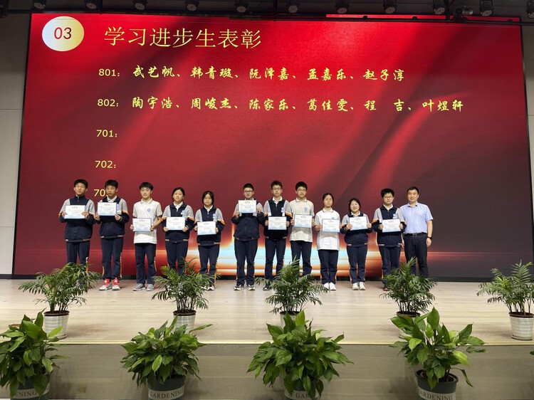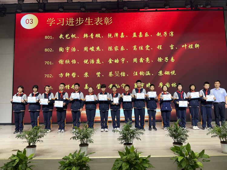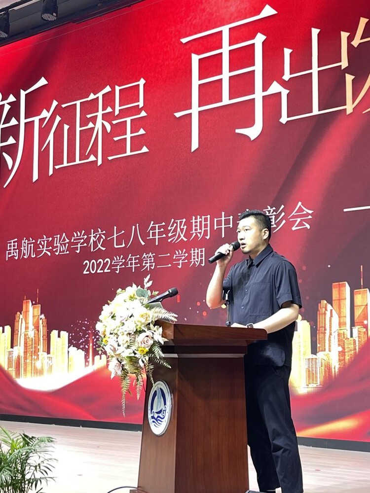 本次期中表彰大会以“新征程,再出发”为主题,由姚晨老师主持。大会由“收获篇”—“分享篇”—“寄语篇”三个篇章组成,向我们展示了七八年级学生不负韶华,昂扬向上的精神风貌。