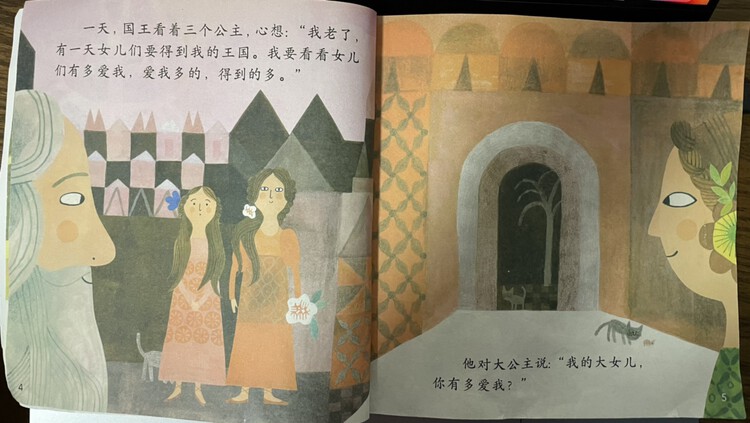 《你有多爱我》讲的是一个国王与他的三位公主女儿的故事。国王想知道自己的三个女儿有多爱自己,大公主和二公主用甜言蜜语讨国王欢心,而国王不愿意听小公主最自己朴实无华的爱,最后在事实面前终于明白了小女儿对自己深沉的爱。