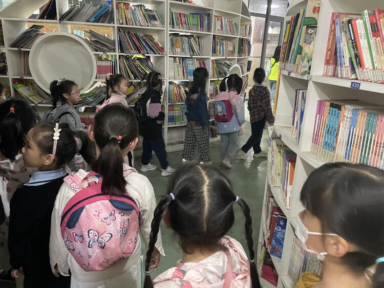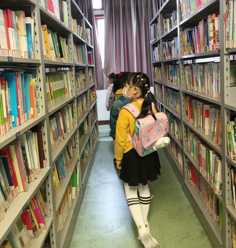 各色的图书引入眼帘,孩子们被整墙的书本所震撼。