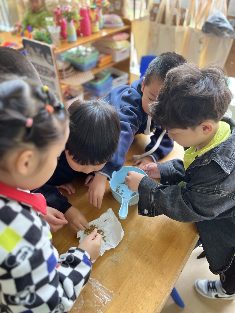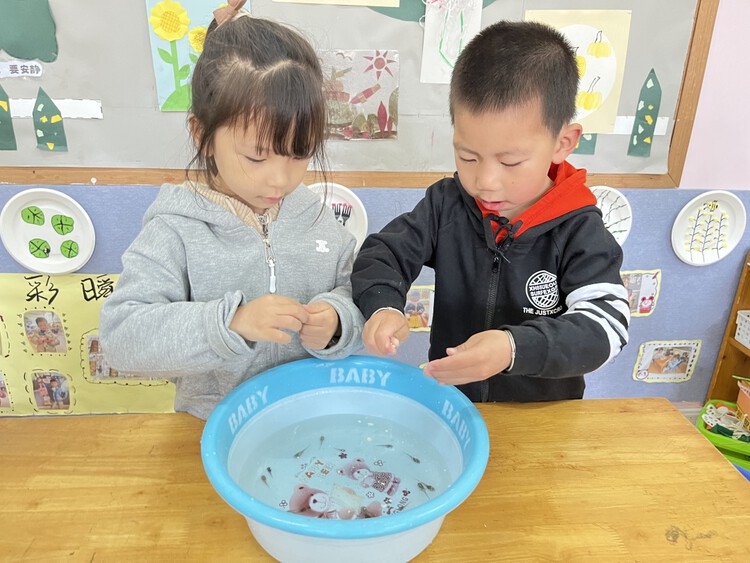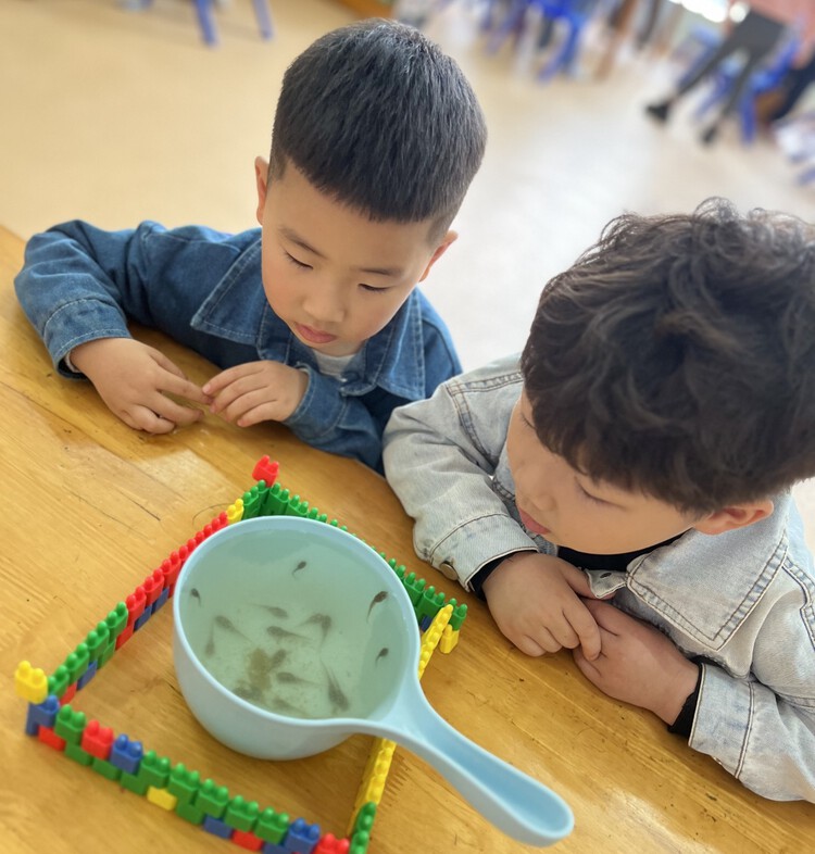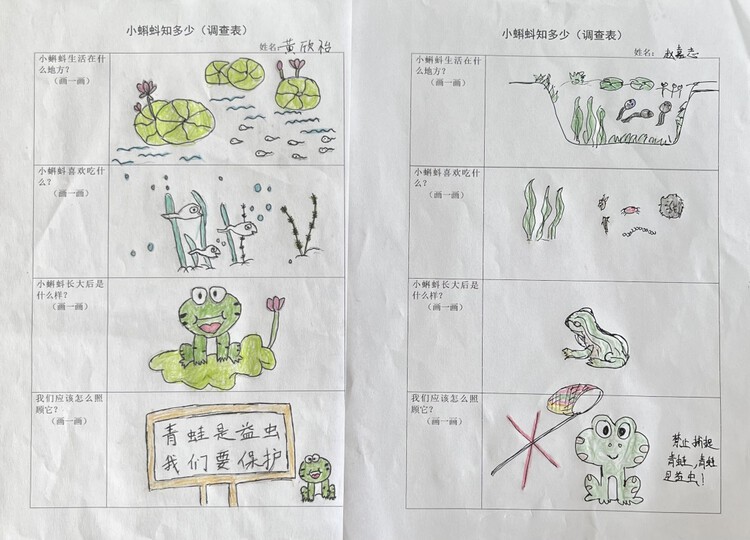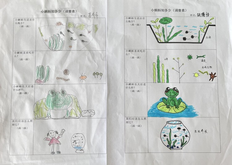 以前孩子对于小蝌蚪的认识来自书中、电视上。在饲养小蝌蚪的这段时间里,孩子们每天都去观察、记录他们的发现,在照料小蝌蚪的过程中产生了浓厚的感情。漫长的等待,亲眼目睹了小蝌蚪的生长变化,孩子们无比开心。