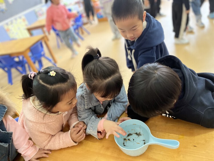 有一天,晨晨小朋友带来一些小蝌蚪,其他小朋友们看见后,特别的好奇,都纷纷围在一起观看,大家一边看,一边七嘴八舌地议论着这个黑黑的小东西。
