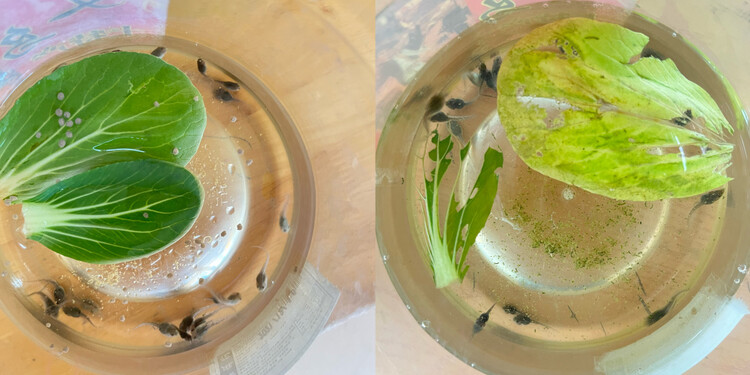 小蝌蚪不仅会吃面包屑、碎饼干、鱼食、肉末、米饭,还吃菜叶呢!而且小蝌蚪吃东西的时候会把头抬起来哦!
