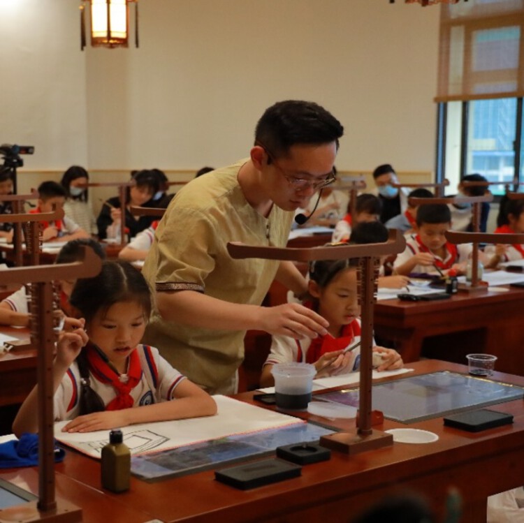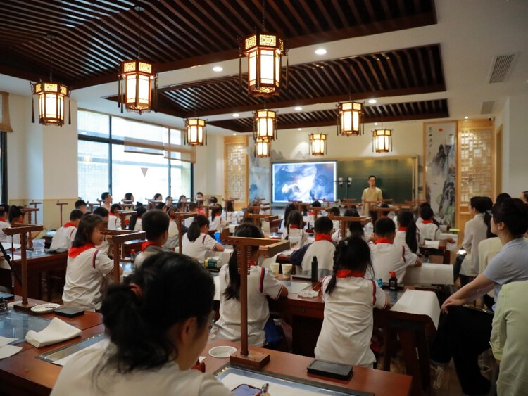在学校智慧教室中,田老师利用数智技术进行美术(水墨画)教学及互动评价。利用平面触摸感应和实时互动的技术,以数字化书法手写板为媒介,通过数字化书法教室内的设备得以实现。教师在讲台上通过三轴摄像台进行全屏实时直播的笔触示范和电子水墨画教学示范,学生通过桌面平板观看,示范结束后,学生可拿起毛笔在自己的屏幕上跟着老师继续学习,亦可自由创作,创作完毕后,可将作业实时分享,完成互动点评。