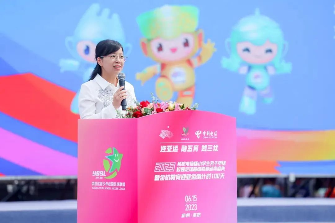 区委常委、区政府党组成员汤丽玉为活动致辞。她指出,体育锻炼是增强少年儿童体质最有效的手段。近年来,余杭积极践行“阳光”体育工程 ,立足校园足球特色发展,全力打造“校园足球”余杭品牌。随着此次余杭区小学生男子甲组校园足球超级联赛的广泛开展,余杭少年充分发扬体育道德风尚,以最优的精神风貌、最佳的竞技状态,赛出风格、赛出水平。她希望,各参赛队的同学们将赛事中激发出的团队意识和拼搏精神投入到学习和生活中,坚持运动、努力学习、砥砺意志,争做德智体美劳全面发展的好少年,争当杭州亚运的主人翁!
