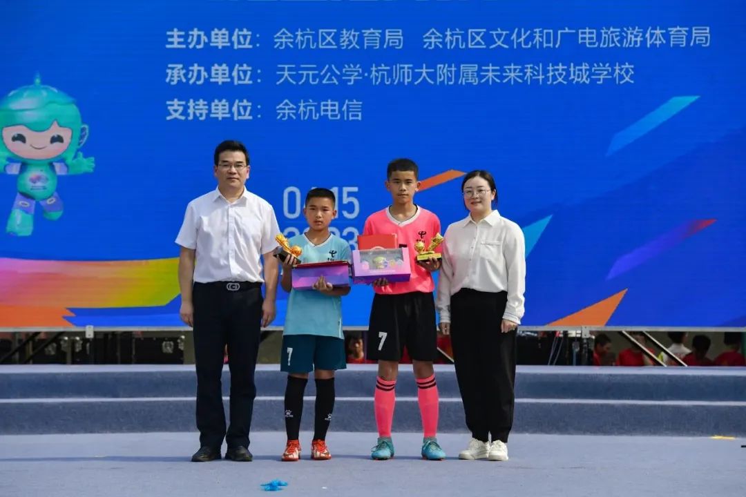 现场,余杭区小学生男子甲组校园足球超级联赛总决赛拉开帷幕。亚运标准、现场直播、专业解说、球迷助威……这些元素与校园足球结合在一起,奏响了余杭师生迎接亚运的精彩乐章。