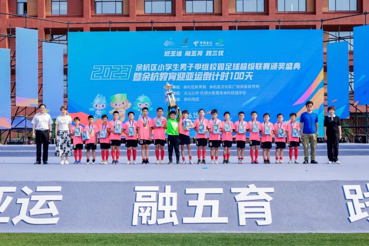 6月15日,杭州亚运会迎来百日倒计时,亚运圣火在余杭良渚熊熊燃起。值此时刻,余杭校园也燃起“亚运之火”,“迎亚运 融五育 践三优”小学生男子甲组校园足球超级联赛颁奖盛典暨余杭教育迎亚运倒计时100天专场活动盛大举行。16.5万名余杭师生共襄盛会,喜迎亚运。
