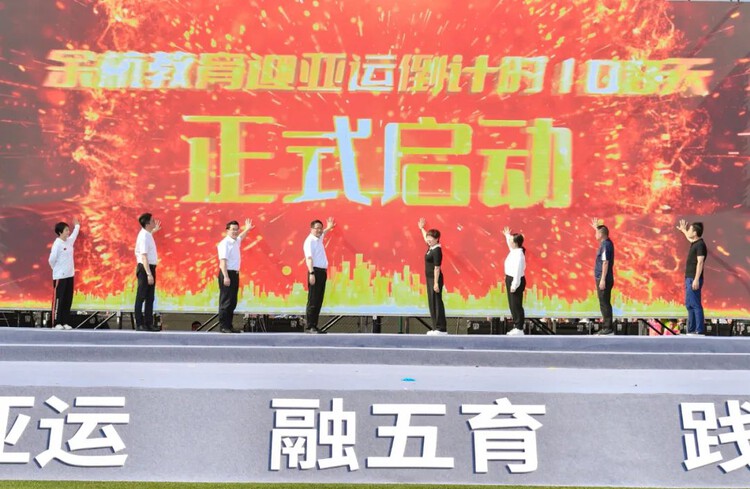 现场,领导嘉宾上台共同启动余杭教育迎亚运倒计时100天,标志着余杭教育系统将全力冲刺迎接亚运到来。