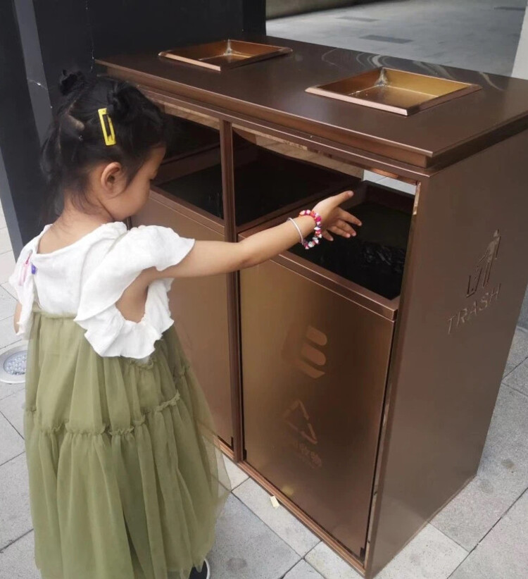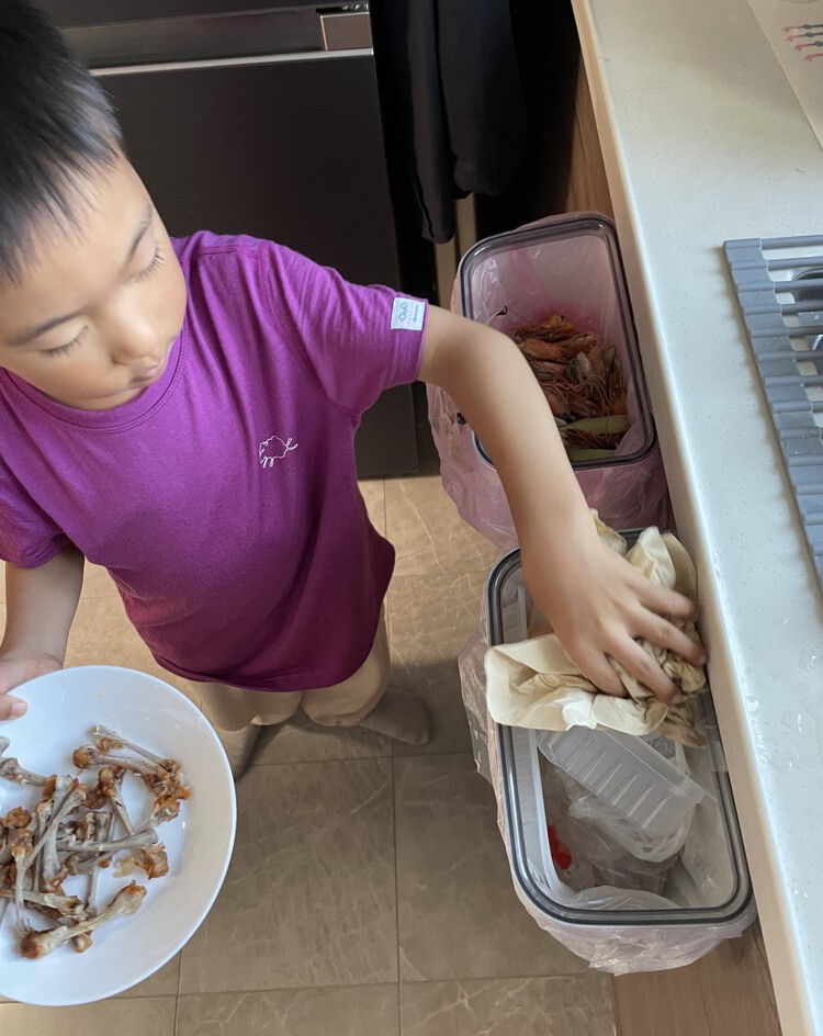 垃圾桶有四种颜色,要放不同的垃圾,我知道香蕉皮要扔绿色垃圾桶,是易腐垃圾。