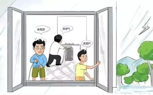 暴雨来临,关闭门窗,防止雨水扑入屋内,一旦进水立即关闭电源、煤气等设备。