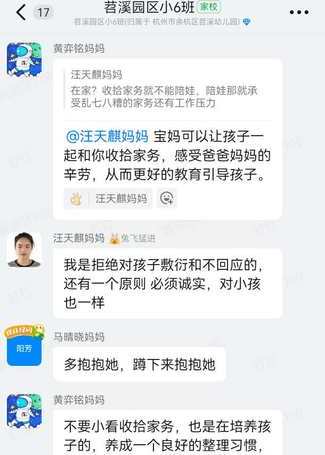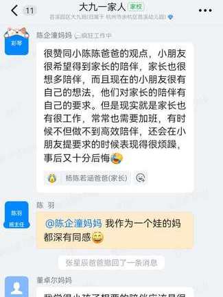 各班以班级钉钉群线上团讨方式,聚焦关键性问题——什么是高质量陪伴,聊一聊在陪伴孩子成长的过程中有什么样的困惑,以及自己对于高质量陪伴理解。