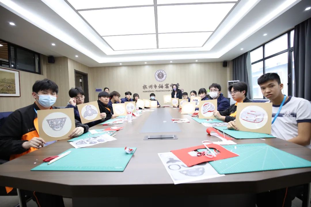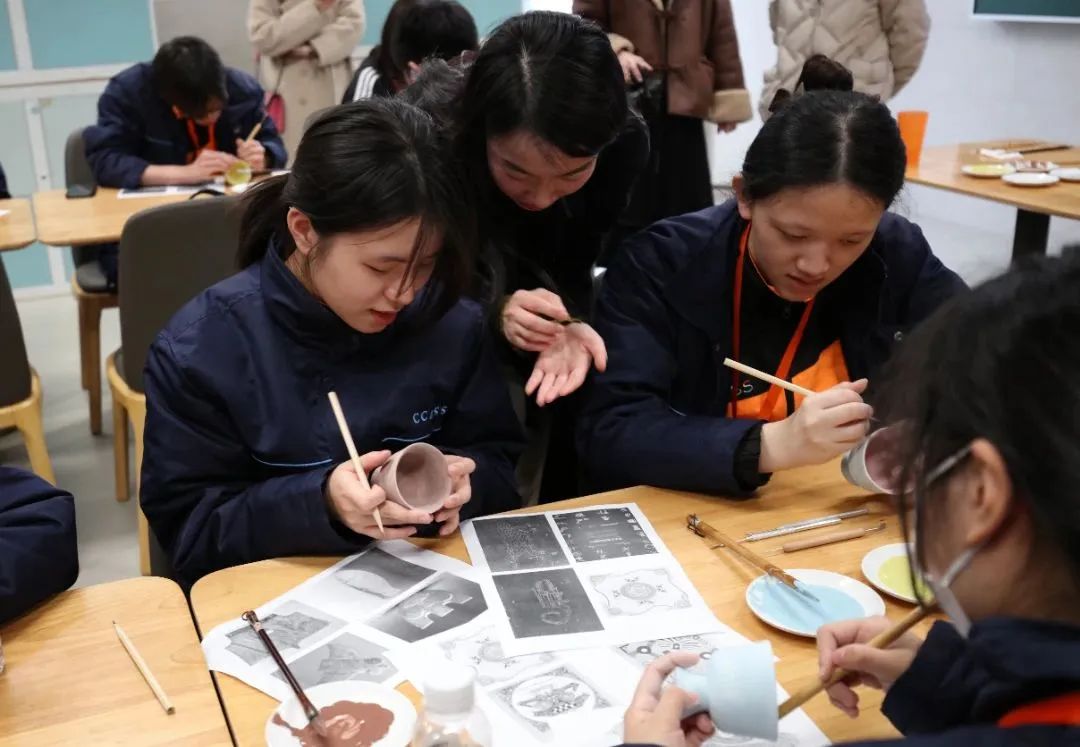 走进学校美术馆的速写班,两地学生们在老师的指导下,专注地为同伴们创作着肖像画;陶泥彩绘课上,老师结合地域特色进行了良渚文化纹饰相关知识的科普,让学生们将良渚文化的神秘刻画符号重新创作,融入自己的创意作品中;剪纸课堂中,学生们拿着刻刀小心翼翼地雕刻着手中的“神人兽面纹”。