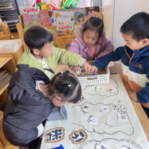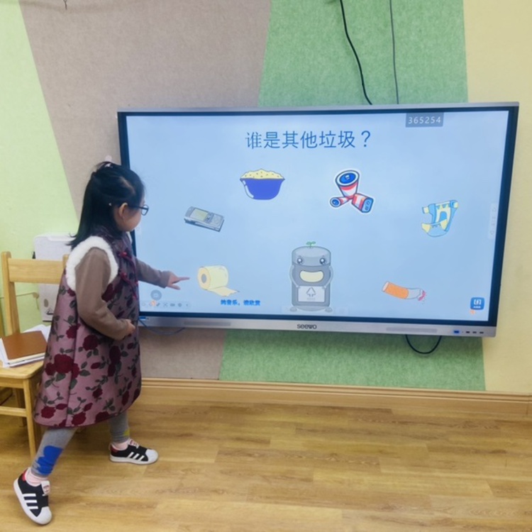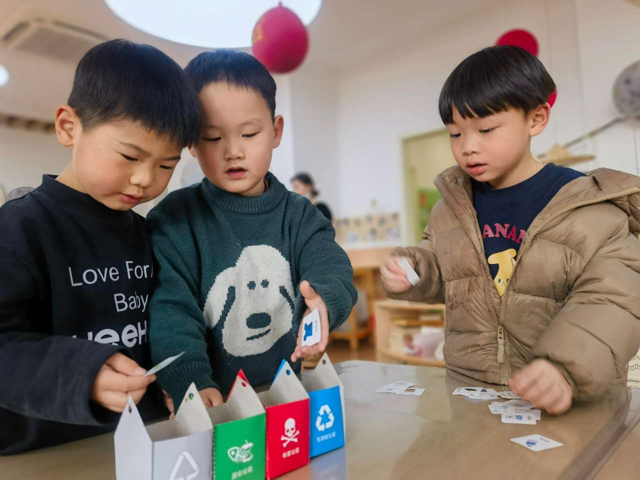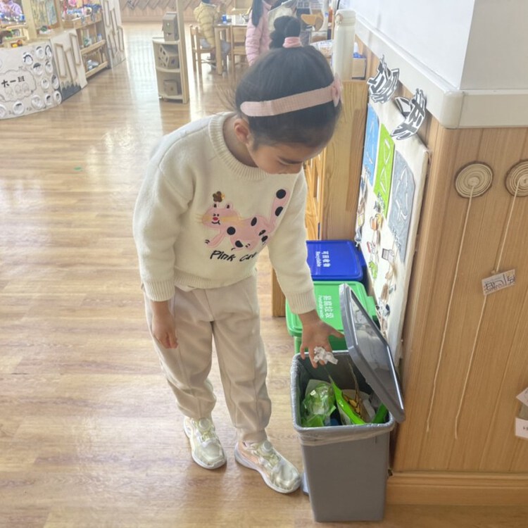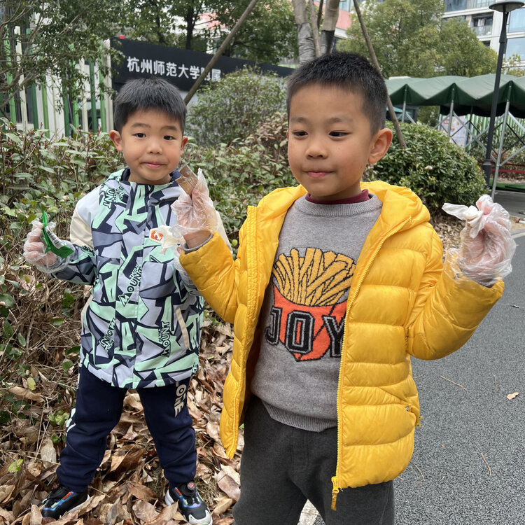 老师和小朋友寻找身边的垃圾,通过主题活动,师幼小游戏等,增加幼儿对垃圾分类的认知。