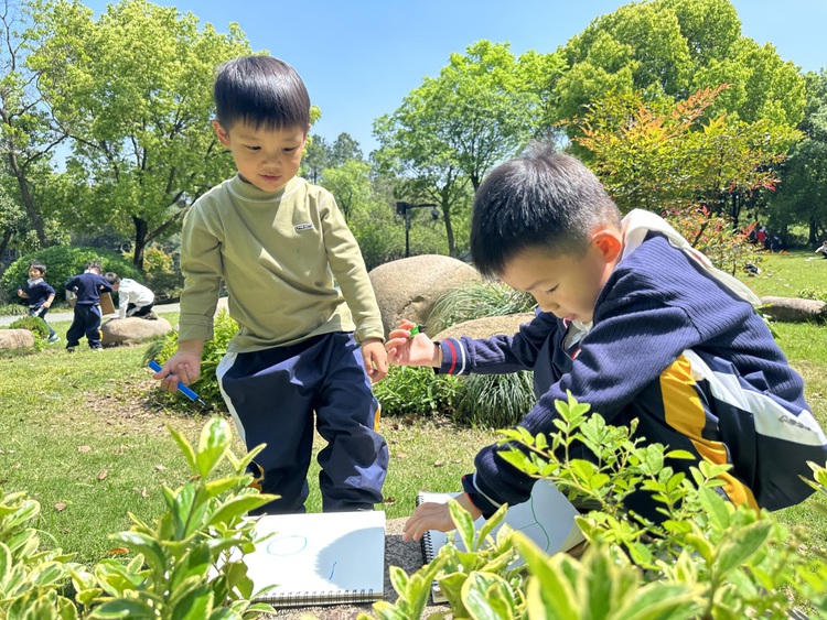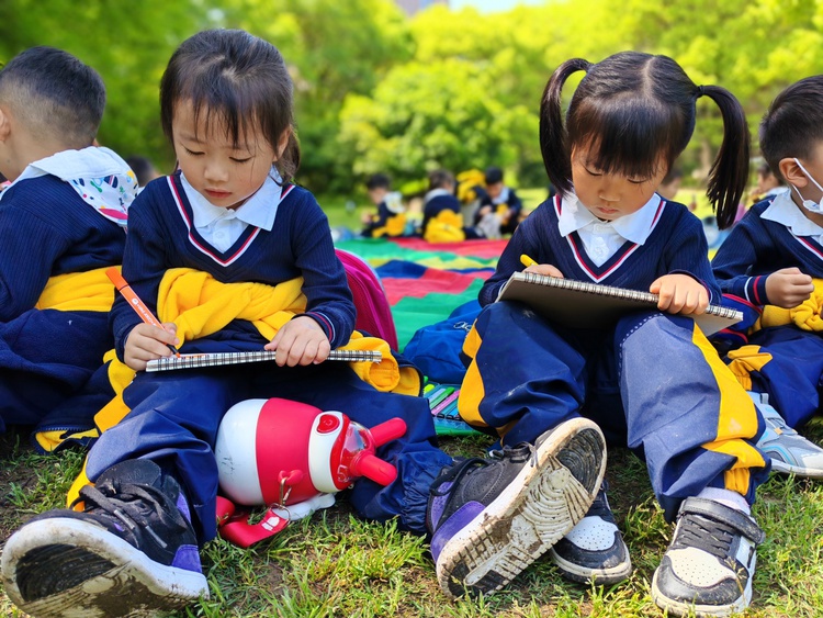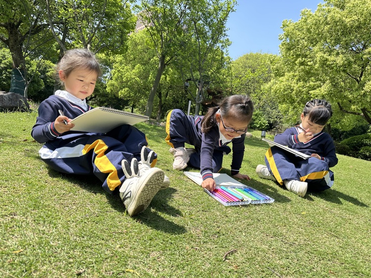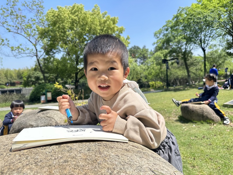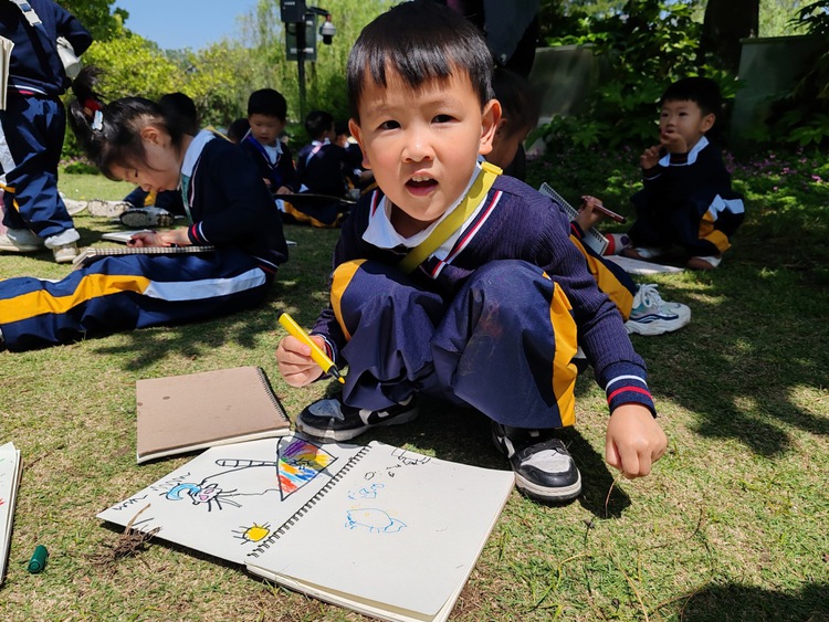 孩子们把画画课堂搬进了大自然,他们用眼睛观察身边的一切事物,闭上眼听一听声音,用鼻子嗅一嗅香气……将春天的色彩都藏到自己的画本中。