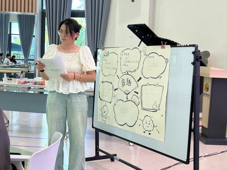 科凯小班教研组以《感官游乐园》主题下项目活动《小小音乐会》中审议为例,针对“如何在与孩子的互动中提供支架”、“在主题实施过程如何更多的引发孩子的思考”、“当孩子的兴趣点很多时,如何判断与主题关联的价值点”等进行互动交流,展开教研。