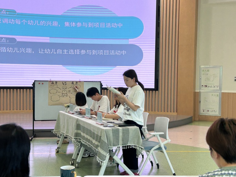 中班教研组以完整儿童《我来显身手》主题下衍生的项目活动《我想更懂你,职业初体验》中审议为例,并以辩论的形式展开,引导教师辨析项目活动实施中教师应该调动幼儿兴趣集体参与还是遵循幼儿兴趣自主选择参与到项目,理清二者之间的关系。