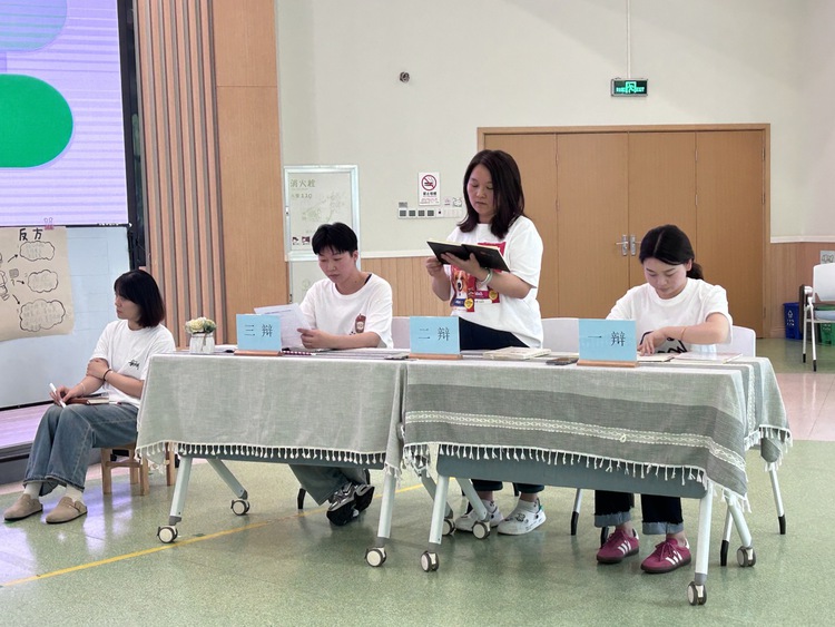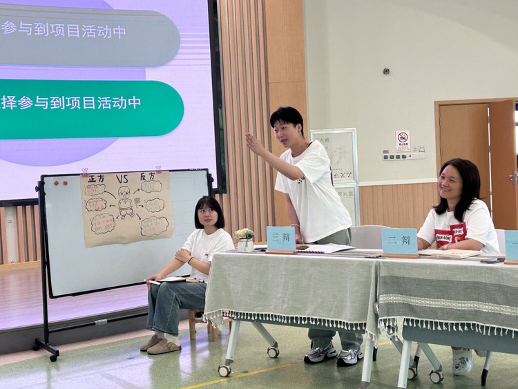在项目活动分享结束后,开始了分为“针锋相对”时刻、法庭式盘问阶段和自由辩论阶段这三个部分的辩论活动。教师们大展身手,充分发表自己的意见和想法。
