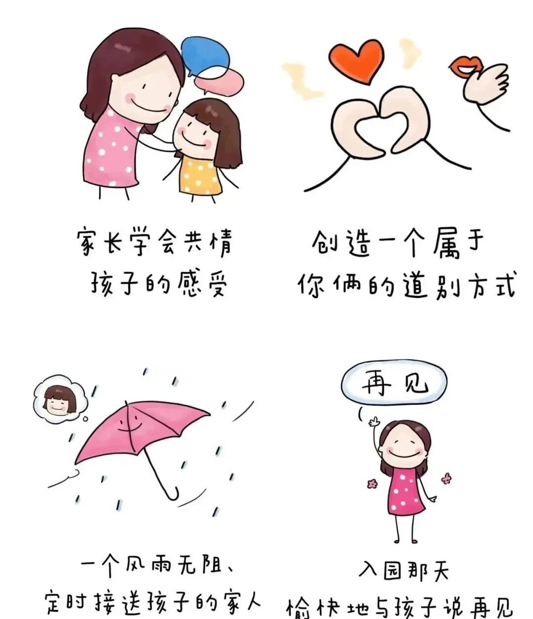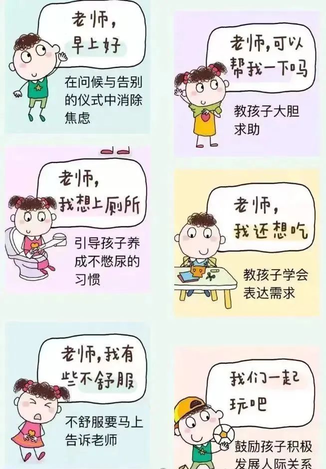 心理准备篇 1 相信孩子 孩子的能力远远超出大人的想象。在刚刚进入幼儿园的那几天,他们哭闹无法避免,家长要放平心态,相信孩子,树立孩子的信心,引导他们尝试着主动解决生活中的难题,坚信孩子有很强的适应能力。只要家长和老师给予适当的引导,上幼儿园就是一件非常快乐的事情。 2 相信老师 幼儿园是个安全的地方,幼儿园的老师都是经过专业培训,了解孩子的心理,富有爱心和责任心的。家长要相信老师们,并在孩子前面树立老师的良好形象,不做负面的心理暗示,与老师携手共促孩子成长。 3 积极的心理暗示 家长要在言行中流露出幼儿园是个温馨有趣的地方。孩子是敏感的,会通过家长的情绪来感受幼儿园,所以家长们的积极态度会让孩子感受到幼儿园是个安全、有趣的地方。 用正面的语言来鼓励他们,多用爱抚、拥抱、亲吻等肢体语言,让他们感受到爸爸妈妈的爱一直都在。也可以给宝贝一个魔法亲亲、爱心抱抱,让他们带着妈妈的爱勇敢地去上幼儿园。 亲爱的家长朋友, 入园是幼儿从家庭走向社会的第一步。 这一步,既是他们的成长, 又是对他们的一次历练。 让我们家园携手, 一起为孩子们做好全方位的入园准备, 助力孩子更快地适应幼儿园生活。 -END-