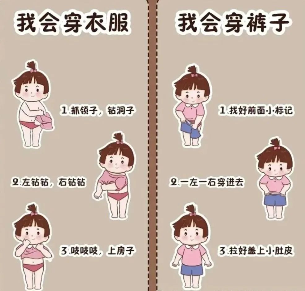 家长抓住每一次换装的机会,让孩子辨认衣服的正反,鼓励他们自己穿脱衣服掌握的生活技能。
