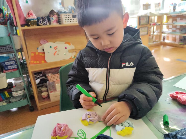 画出花的根茎,叶柄,再将做好的花朵黏在画好的叶柄上,最后画上叶子,就完成创作啦!