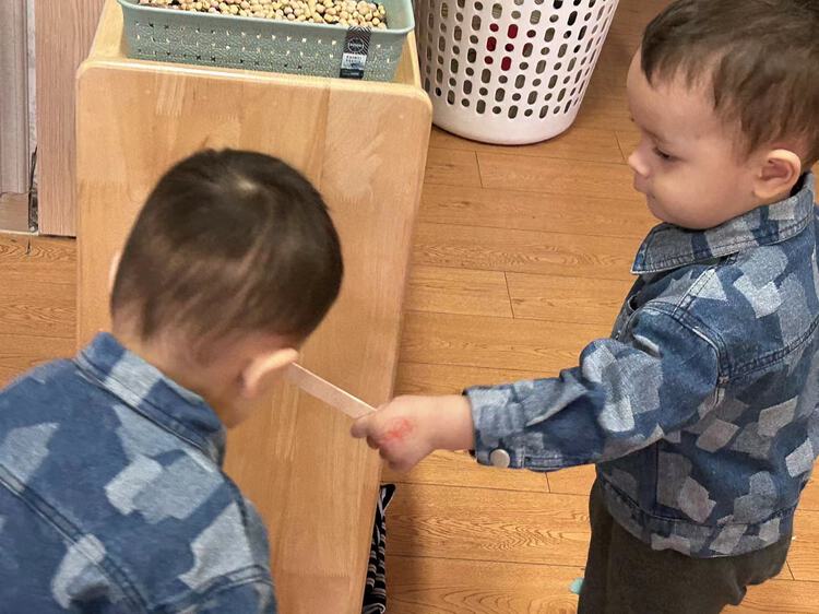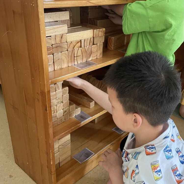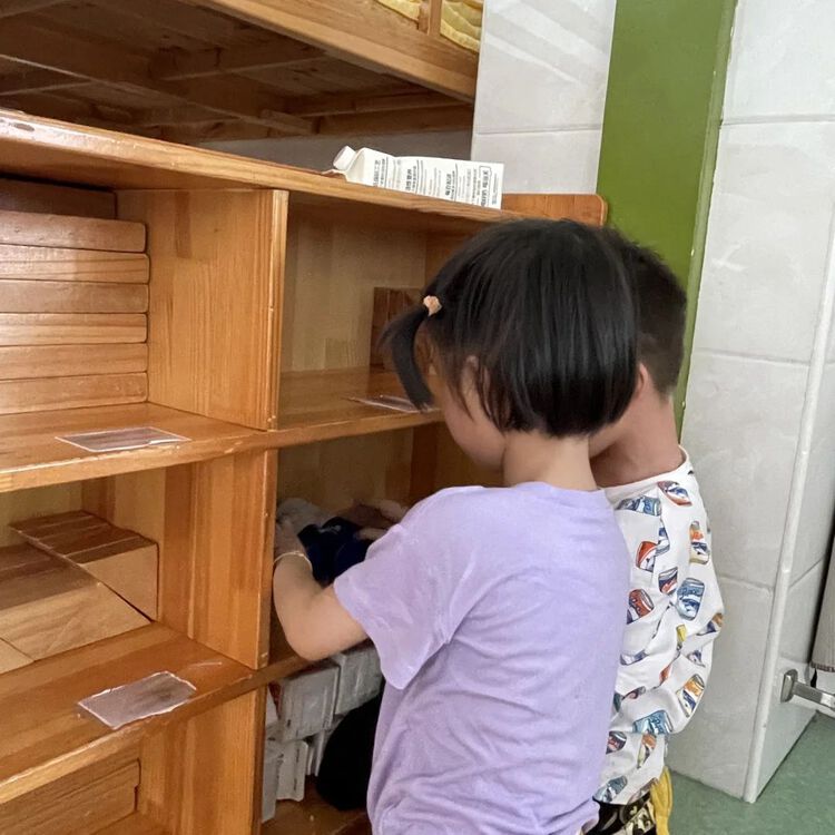 除了按照外形特征分类,还能按功能、颜色、大小等进行分类,孩子们还会看标记,将盘子送到正确的玩具柜处。