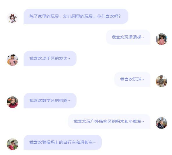 就这样,孩子你一句我一句地表达出自己喜欢幼儿园的玩具。接下来我们一起去寻找幼儿园里的玩具吧。