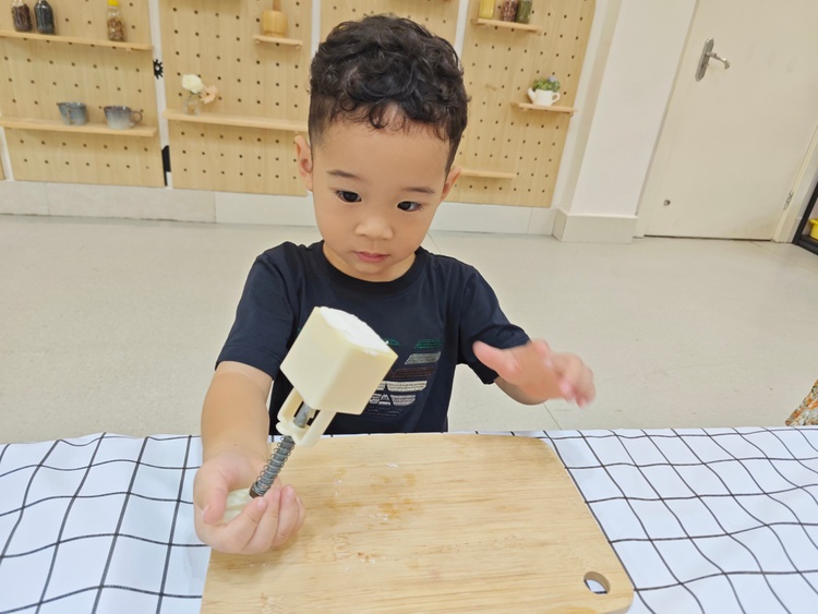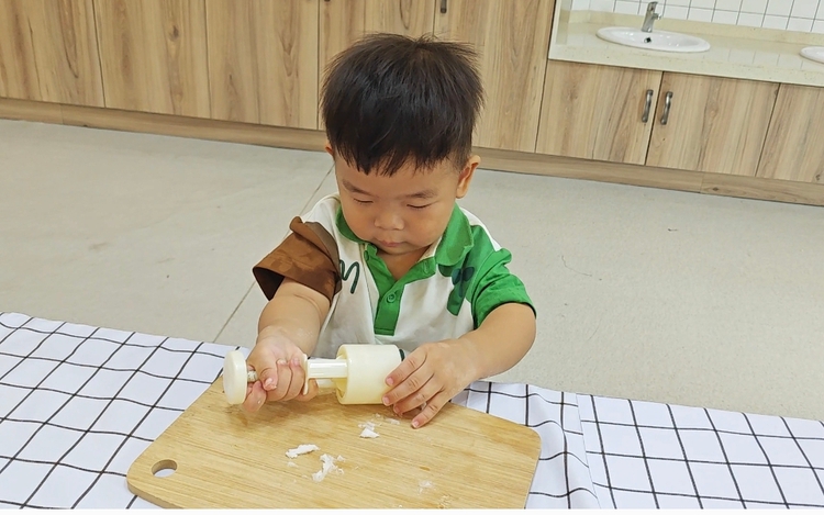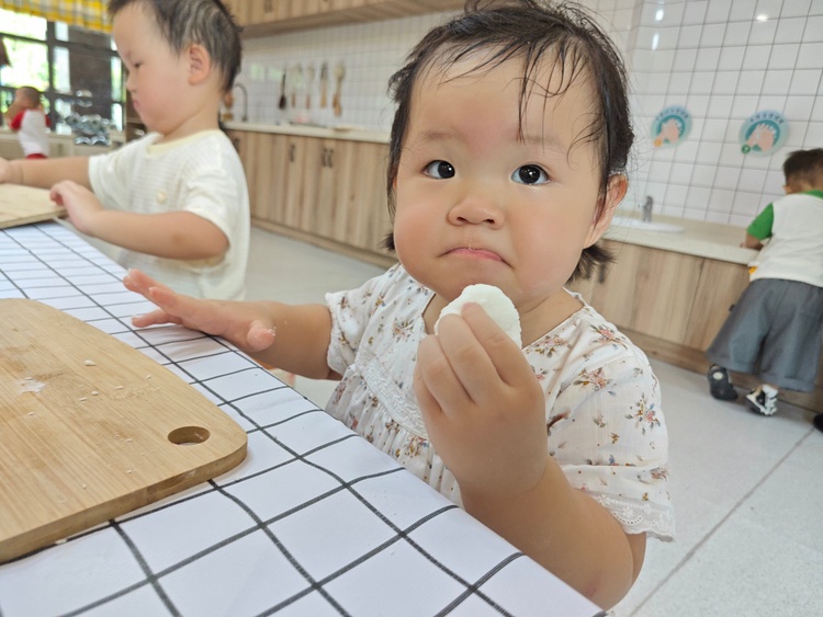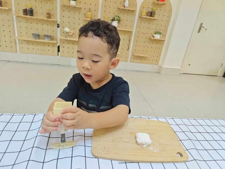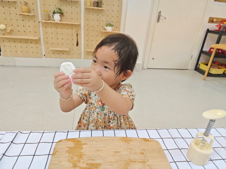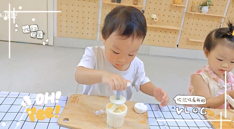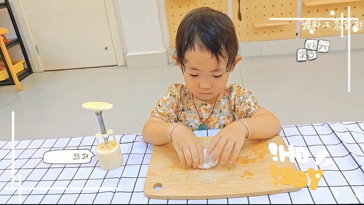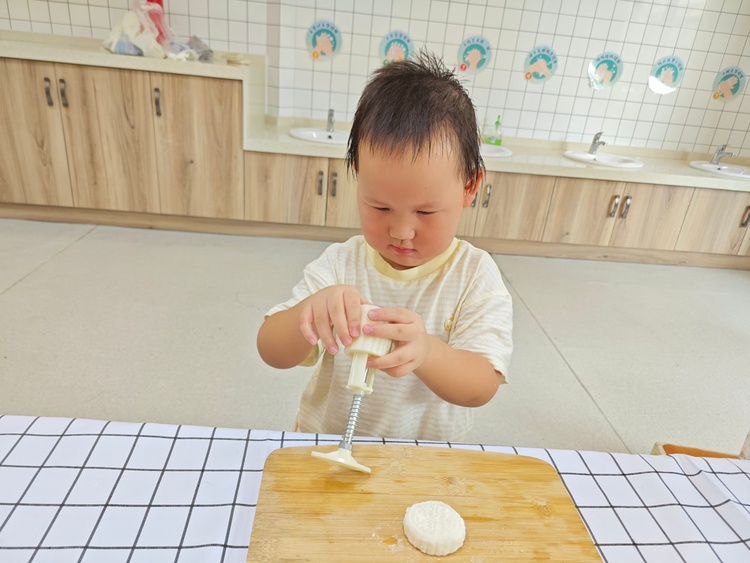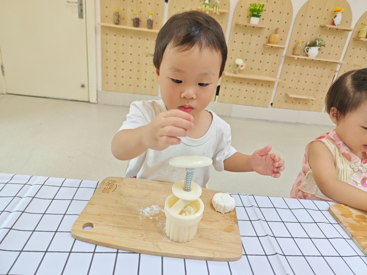 托班萌娃们在秋分时节一起开始动手制作冰皮月饼。摊平饼皮、放入馅料、揉圆、然后轻轻放入模具压制图案,不一会儿,一个个圆圆的精美月饼就做好了。