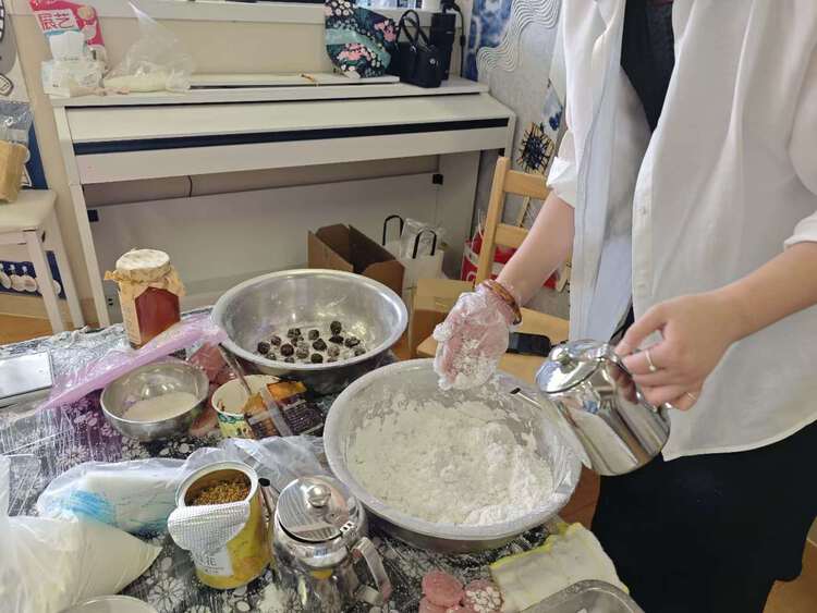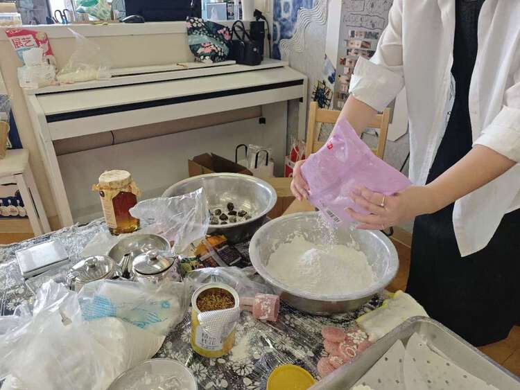 首先根据比例放入糯米粉和粘米粉,接着把白砂糖舀入碗里,加入温水,反复搅拌,让白砂糖充分融化。