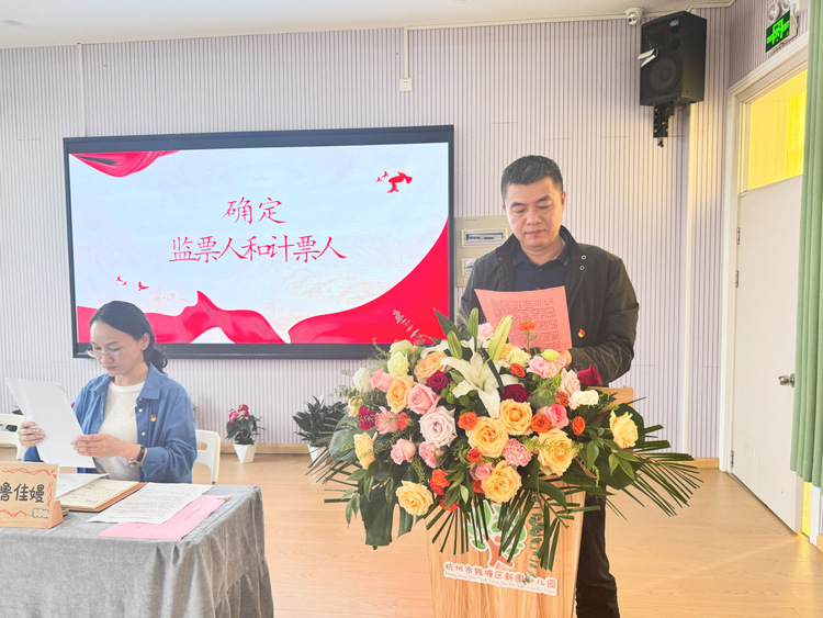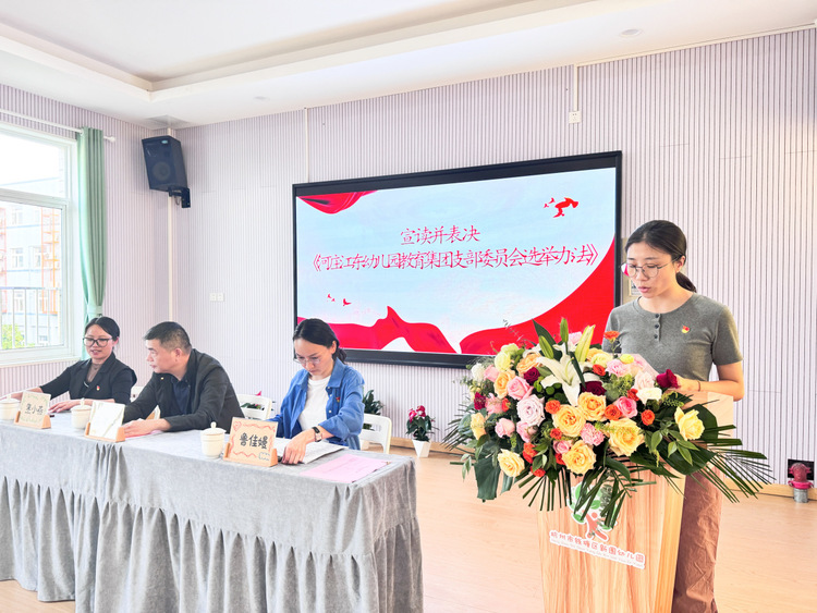 会议第三项,何晶迪同志宣读《中共杭州市钱塘区河庄江东幼儿园教育集团支部委员会选举办法(草案)》。