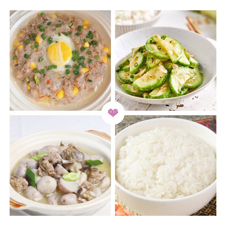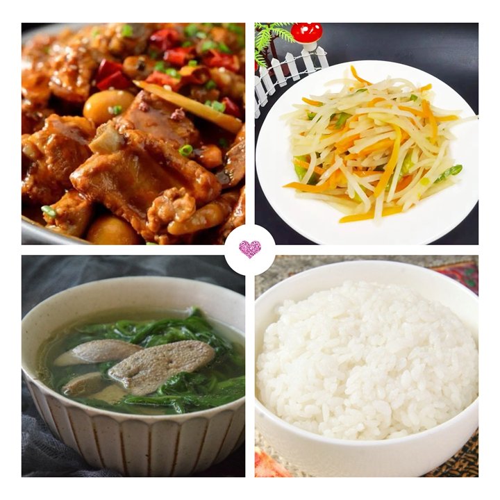早点:鲜奶、面包午餐:仔排煲、三色土豆丝、猪肝青菜汤、大米饭
