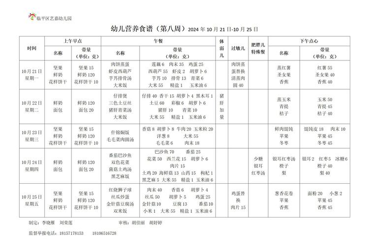 艺嘉幼儿园第8周食谱