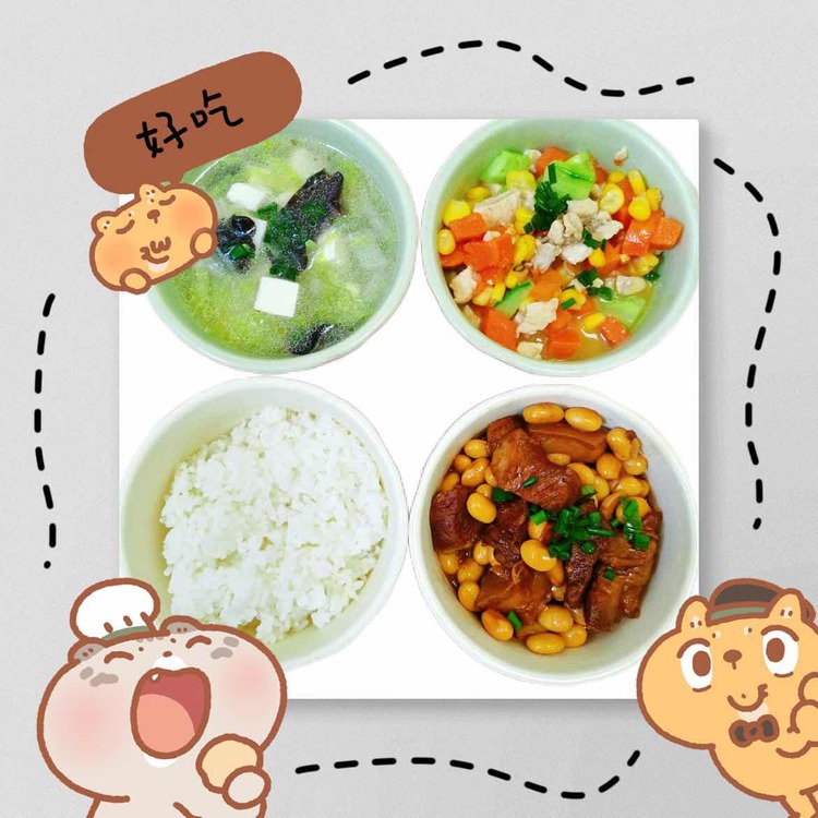 午餐:老黄豆炖肉、金玉满堂、娃娃菜木耳豆腐汤、大米饭;