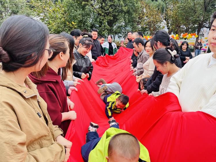 小朋友变身小蚂蚁,在大朋友由红色长布搭建的小路中,爬爬爬,锻炼小朋友的爬行能力,爬行是一种综合全身协调的活动,能够锻炼到小朋友的四肢活动性和灵活性,可以更好的增强小朋友的身体各部位对于触觉的感受力。